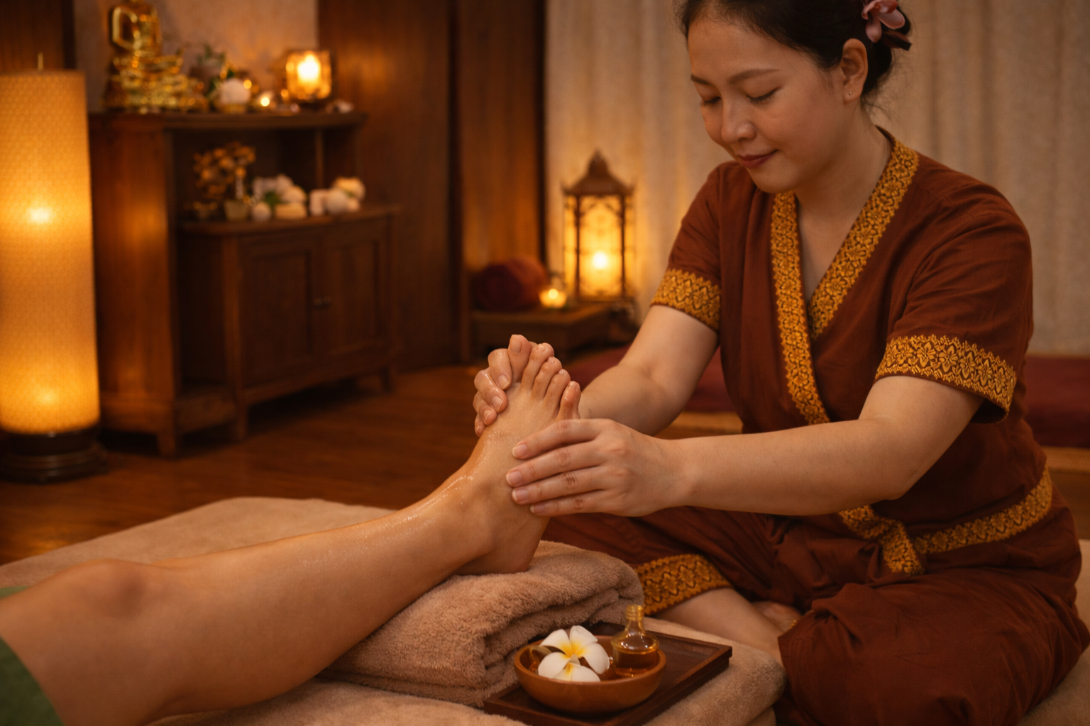Massage ciblé des pieds basé sur les points de réflexologie thaïlandaise. Idéal pour réduire la fatigue, stimuler la circulation et rétablir l’équilibre du corps.