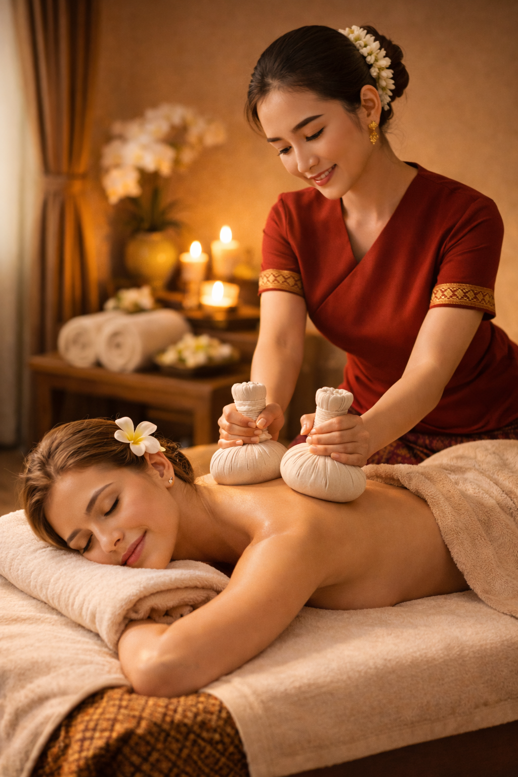 Massage aux pochons d’herbes chaudes selon la tradition thaïlandaise. Aide à soulager les tensions, stimuler la circulation et procurer une détente profonde et enveloppante.